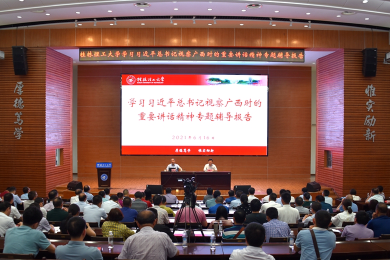 解庆林在总结讲话中表示,陈立生书记的报告政治站位高、理论脉络清、结合实践紧,使我们对总书记重要讲话精神有了更全面的把握、更深入的理解、更切实的体会。他指出,习近平总书记对广西工作的重要讲话精神,是建设新时代中国特色社会主义壮美广西的行动纲领和科学指南。认真学习贯彻落实习近平总书记视察广西时的重要讲话精神,是我们当前和今后一个时期的头等大事和首要政治任务,学好用好总书记重要指示精神也是学校发展的重大机遇。解庆林要求,领导干部要增强政治意识、提高政治站位,把思想和行动统一到习近平总书记重要讲话精神上来,更加紧密地团结在以习近平同志为核心的党中央周围,把学习贯彻重要讲话精神转化为建设特色鲜明、国内知名高水平理工大学的强大合力和自觉行动,解放思想、改革创新、担当作为,以优异成绩庆祝建党100 周年,为谱写全面建设社会主义现代化国家的广西篇章贡献力量!