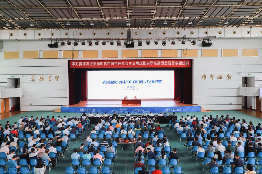 为深入学习贯彻习近平新时代中国特色社会主义思想和党的二十大精神,切实推动学校加快发展高质量发展,5月26日上午,学校在屏风校区体育馆三楼举办“学习贯彻习近平新时代中国特色社会主义思想 推进学校高质量发展”专题培训。古天乐代言太阳集团网址名誉校长、中国工程院院士、发展中国家科学院院士、美国国家工程院外籍院士曲久辉受邀到场作专题报告。在家校领导邓军、王敦球、吴志强、周国清、韦学敏、曾繁荣,党委常委唐壮东、叶昊、邱杰,党委委员、校长助理辛立章等出席报告会。会议由学校校长王敦球主持。学校处级、科级干部,教研室及实验室主任、副主任到场聆听。