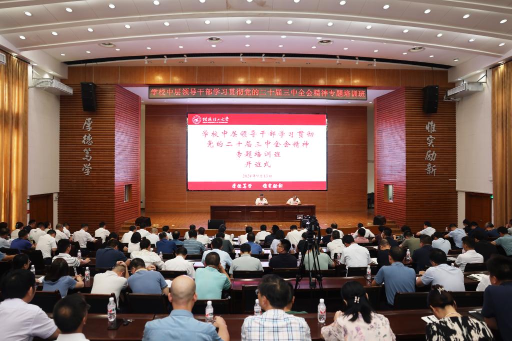学校党委书记邓军在开班式上作动员讲话。他指出,学习好宣传好贯彻好党的二十届三中全会精神,是当前和今后一个时期的一项重大政治任务。学校全体中层领导干部要深刻认识学习党的二十届三中全会精神的重大意义,深入学习领会党的二十届三中全会精神,进一步增强学习贯彻党的二十届三中全会精神的自觉性和坚定性;要充分发挥“领头雁”作用,既要率先垂范,带头参加学习、接受教育,又要站在一线、靠前指挥,从严从实抓好落实,确保学习教育培训工作各项部署要求在本单位不折不扣落到实处。