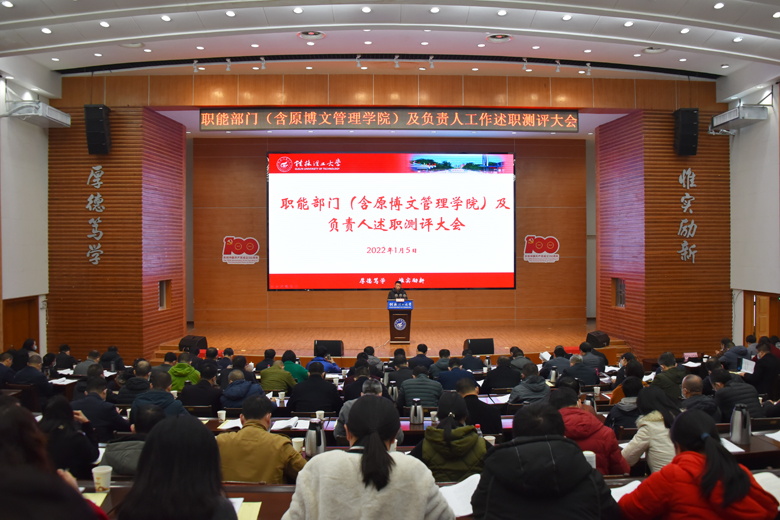 1月5日,学校在屏风校区图书馆报告厅召开2021年职能部门负责人和二级学院院长述职测评大会暨秋季学期期末工作会。校领导解庆林、吴志强、王玫、周国清、梁福沛、王敦球、韦学敏、邓国彬、曾繁荣出席会议,学校党委副书记齐俊斌主持会议。全体中层干部,民主党派及无党派人士代表,部分党代会、教代会代表参加会议。