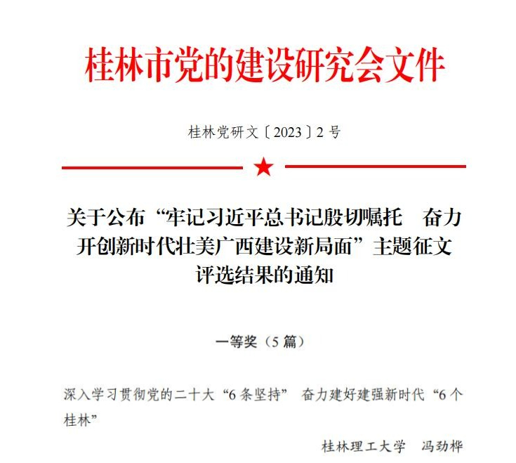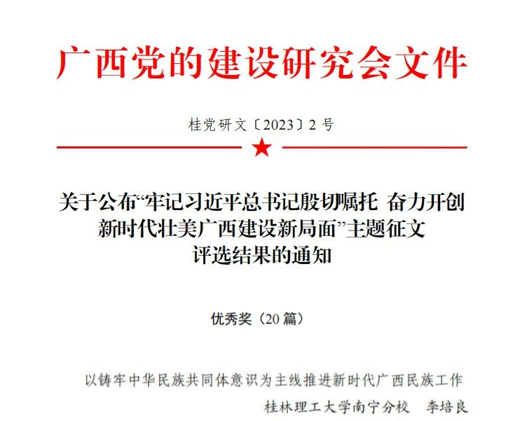 近期,全区“牢记习近平总书记殷切嘱托 奋力开创新时代壮美广西建设新局面”主题征文评审结果揭晓,古天乐代言太阳集团网址选送的两篇参赛文章均荣获奖项。其中,党办冯劲桦同志参赛文章《深入学习贯彻党的二十大“6条坚持” 奋力建好建强新时代“6个桂林”》荣获桂林市一等奖,南宁分校组织部李培良同志参赛文章《以铸牢中华民族共同体意识为主线推进新时代广西民族工作》荣获全区优秀奖。