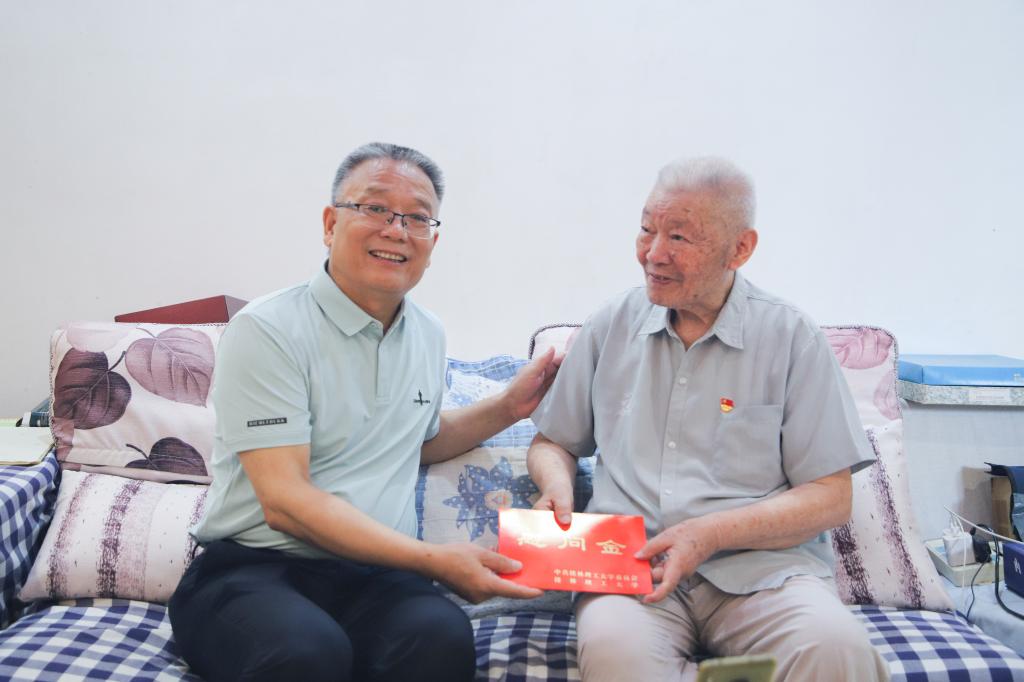 在中国共产党成立104周年之际,校领导农毅、王敦球、韦学敏、王磊、黎贞崇、罗盛锋、唐壮东、曾繁荣分别带队,走访看望慰问了学校优秀共产党员、生活困难党员、老党员代表,向他们送去党组织的温暖与关怀,并致以节日的祝福和诚挚的问候。