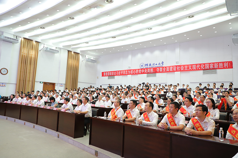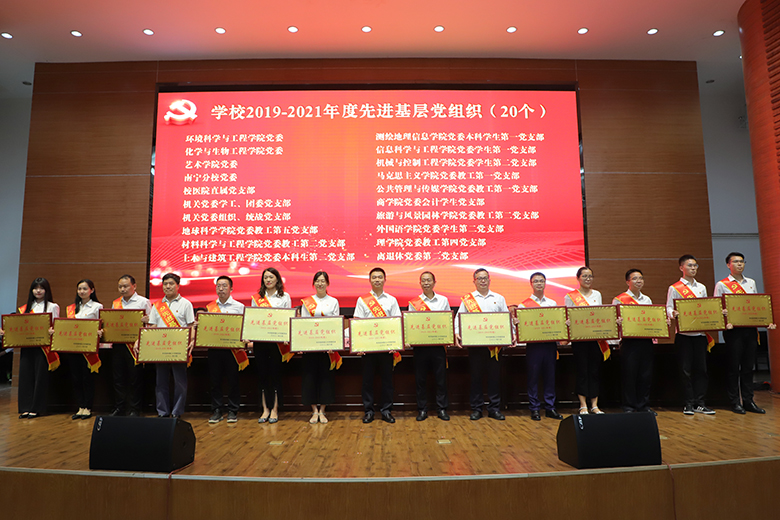 百年征程波澜壮阔,百年初心历久弥坚。6月29日下午,学校在屏风校区图书馆报告厅举行庆祝中国共产党成立100周年座谈会暨2019-2021年度“两优一先”表彰会,表彰自治区党委、自治区党委教育工委以及学校优秀共产党员、优秀党务工作者和先进基层党组织。校领导解庆林、吴志强、王玫、梁福沛、王敦球、韦学敏、邓国彬出席大会。学校党委各职能部门负责人、各二级党组织书记、基层党支部书记代表、教职工党员代表、学生党员代表、离退休党员代表以及民主党派代表参加大会。会议由学校党委副书记齐俊斌主持。