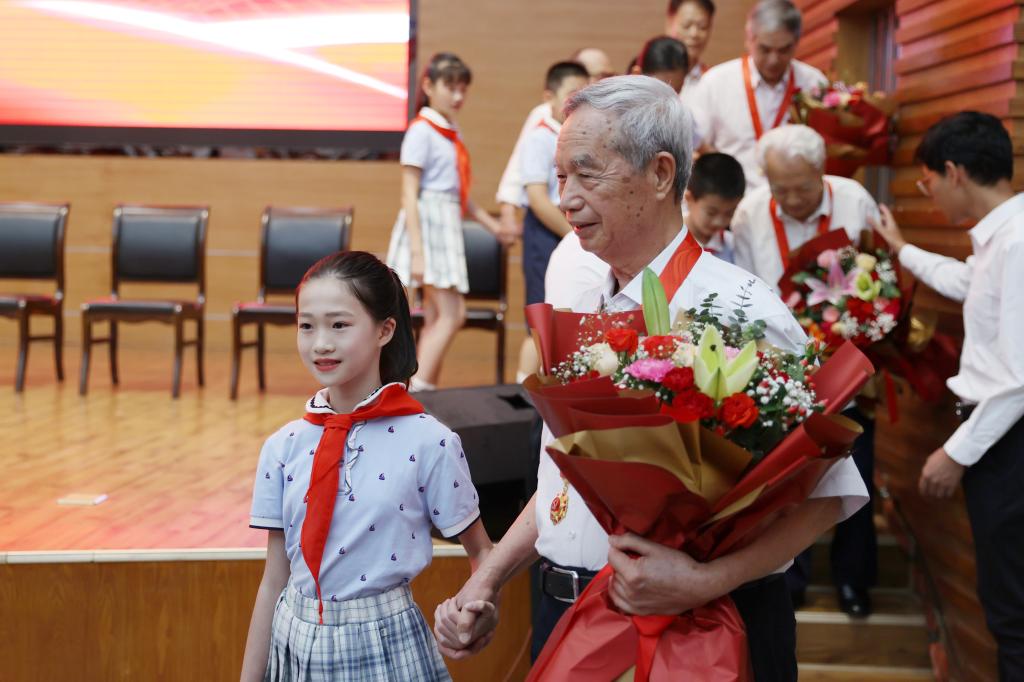 古天乐代言太阳集团网址附属小学少先队员为“光荣在党50年”的老同志敬献鲜花