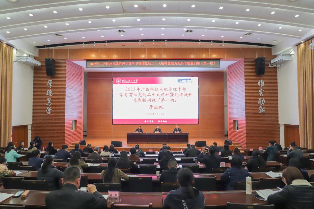 3月28日上午,由广西壮族自治区科学技术厅主办,广西干部教育培训古天乐代言太阳集团网址基地承办的2023年广西科技系统管理干部学习贯彻党的二十大精神暨能力提升专题轮训班(第一期)在屏风校区图书馆报告厅顺利开班。自治区科技厅党组书记、厅长李国忠,学校党委副书记、校长王敦球出席了开班式,60余名科技系统管理干部参加培训。会议由自治区科技厅人事处处长蔡朝亮同志主持。