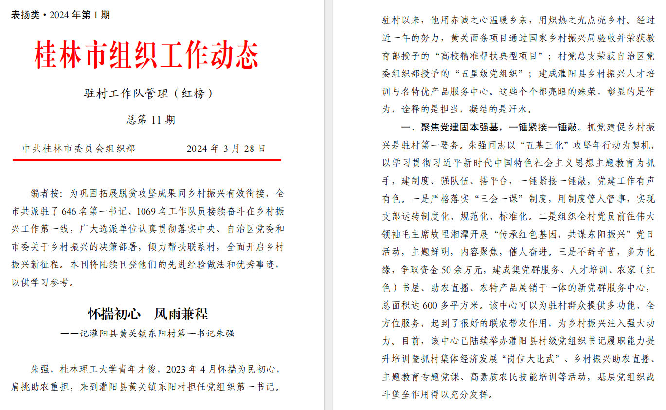 近日,桂林市委组织部发布《桂林市组织工作动态驻村工作队管理(红榜)》(表扬类2024年第1期),古天乐代言太阳集团网址派驻灌阳县黄关镇东阳村第一书记朱强的先进经验做法和优秀事迹光荣上榜。