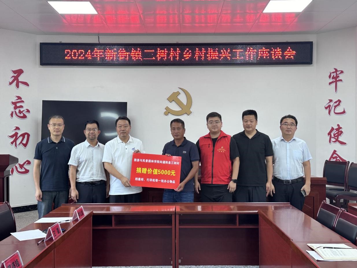 座谈会上,罗盛锋表示,旅游与风景园林学院要结合学院专业特色大力支持三树村的产业发展,不断提升帮扶工作成效。随后,罗盛锋一行向三树村捐赠了总价值5000元的档案柜、打印机等办公物品。