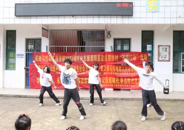 乡村振兴,教育先行。商家村地处桂林偏远地区,落后的乡村教育条件极大阻碍了商家小学教育的发展。近年来,迫于生计,商家村许多青壮年外出务工,村内留守儿童常年在50名以上,而适龄留守儿童只能在商家小学就读。机械与控制工程学院党委大兴调研之风,对于学院而言,如何发挥专业学科优势,挖掘可用资源助力帮扶村改善教育条件,激发留守学生敢于探索、勤奋求学的内生动力,是学院作为帮扶单位当前亟需解决的现实课题。学院依托扬爱公益协会,面向全院师生为商家小学留守儿童募捐了4000余元的学习、生活、体育、文化物资,精心排练青春活力舞蹈节目,为留守儿童献上文艺演出的视觉盛宴与精神甘霖;学院机器人基地利用科研成果-机器狗,现场为小学生们推出科普文化展,旨在将科创精神、前沿科技带给最富好奇心的少年儿童,为他们埋下科技创新的种子,点亮求知创新的灯塔,激发留守儿童的学习热情更好成长成才,助力乡村教育振兴。